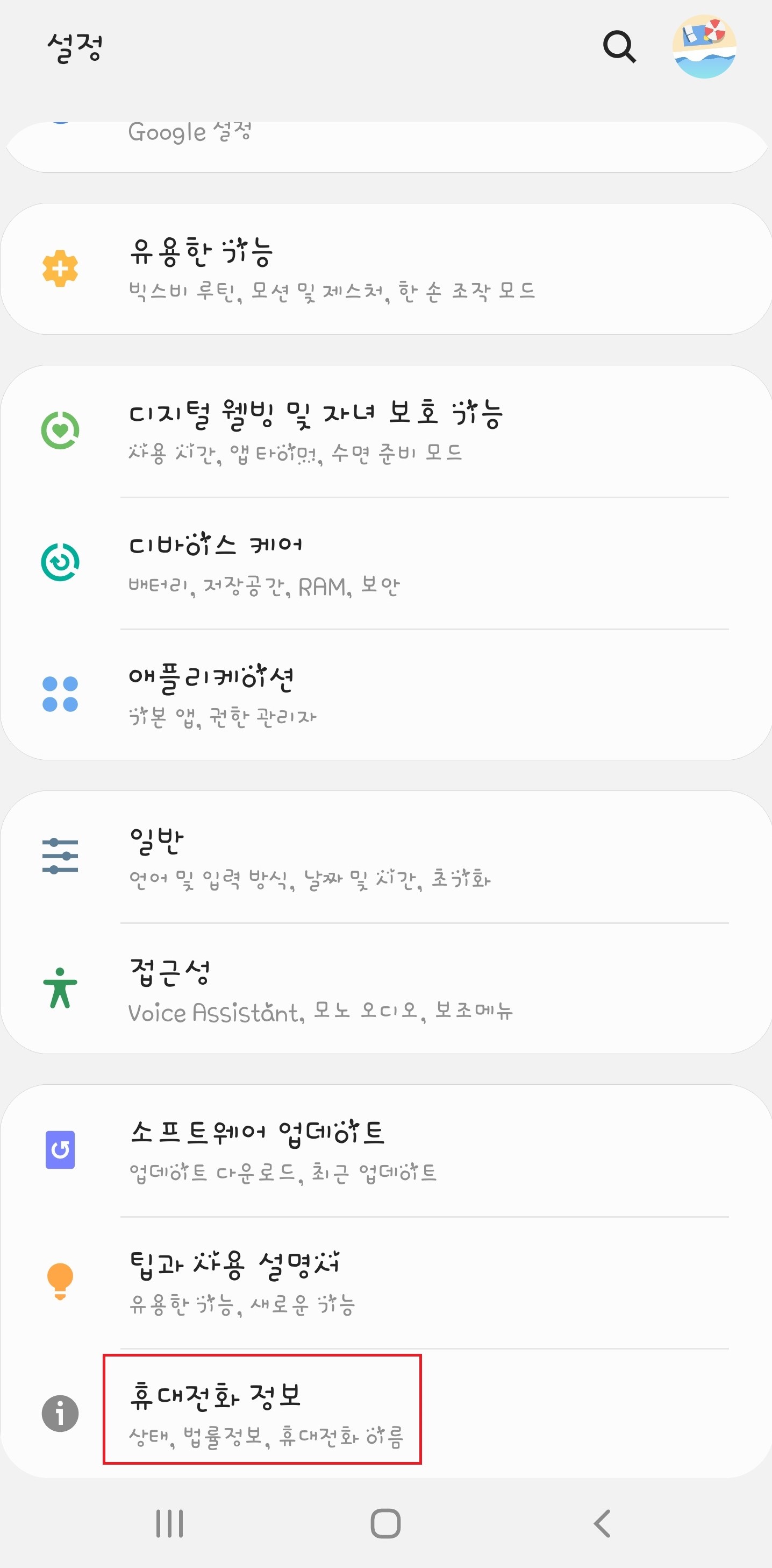 2. 설정 화면에서 화면 제일 아래로 내리기.